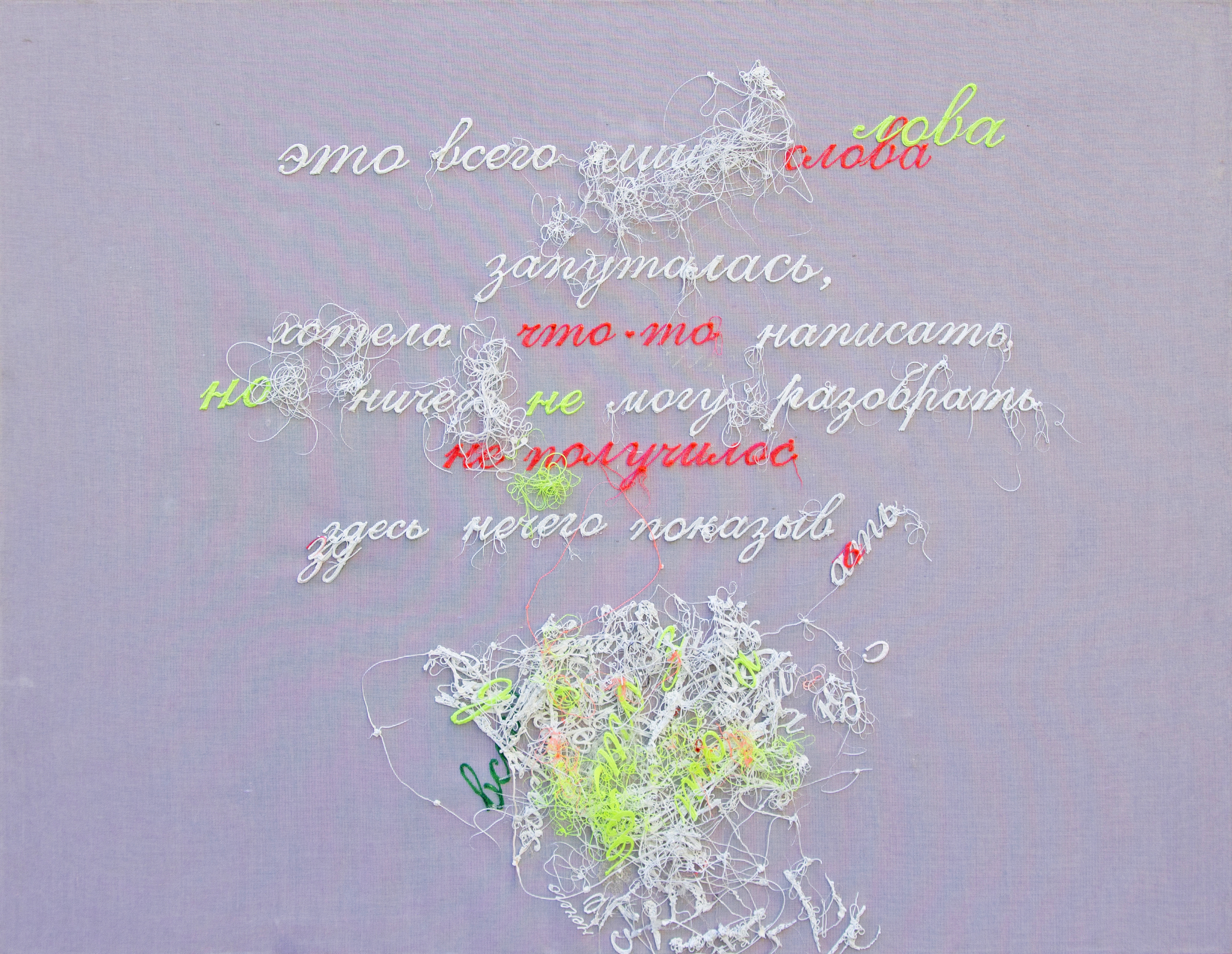 Художница обращается к психологии восприятия мира. Она использует сетки, чтобы показать хрупкость и прозрачность нашего сознания, где живет и нежность, и ощущение собственной телесности и погружение в окружающий контекст. Юстина Комиссарова была несколько раз представлена на ярмарке Cosmoscow, входит в состав участников группы Parazit, ее работы можно увидеть в крупных коллекциях Москвы и Санкт-Петербурга. Галерея Артократии показывала ее работы на проектах в Москве и Ярославле. Работа «Это всего лишь слова» показывает, как путается наше сознание, когда слишком много мыслей и ощущений происходят одновременно.